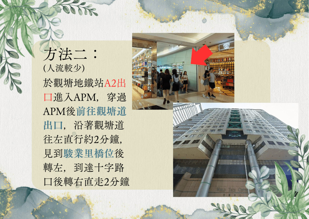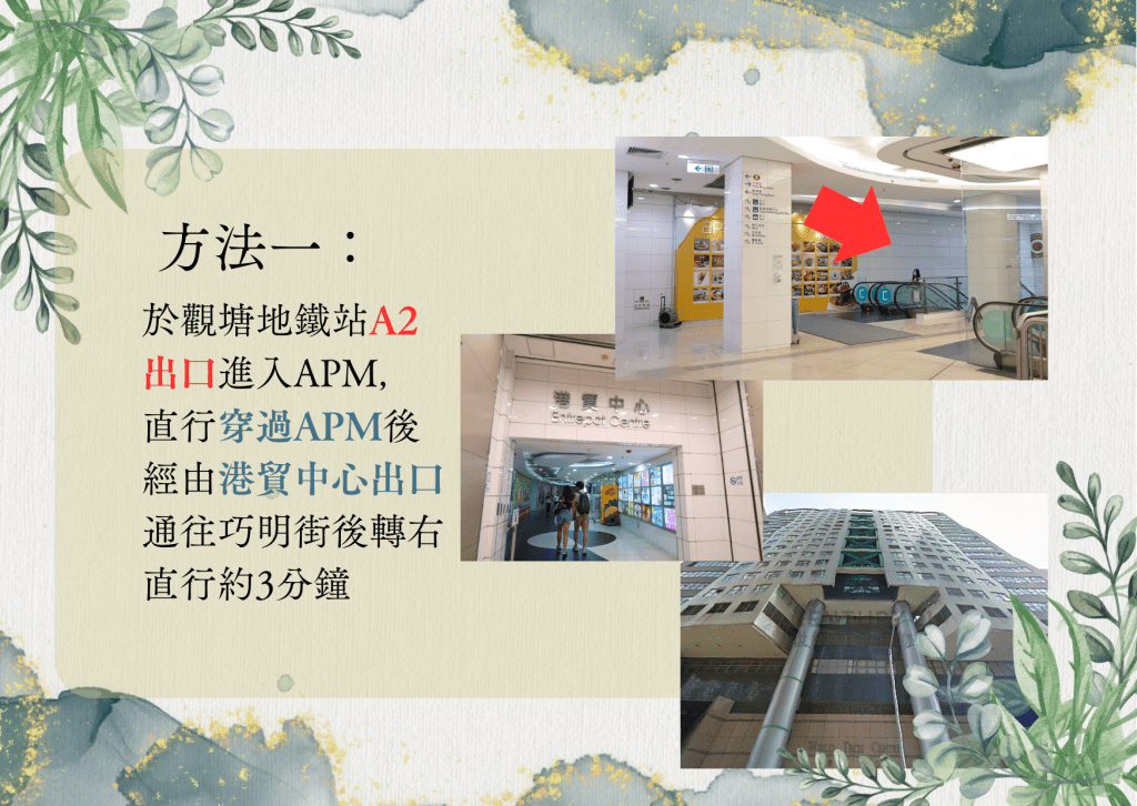 - 觀塘 地鐵站 A2出口 -> 直走穿過APM(Godiva旁邊)前往港貿商埸出口 -> 到達巧明街後往右直行(需過一條馬路) -> 智選假日酒店旁邊 -> 到達 世達中心 (A/B扶手電梯均可到達)